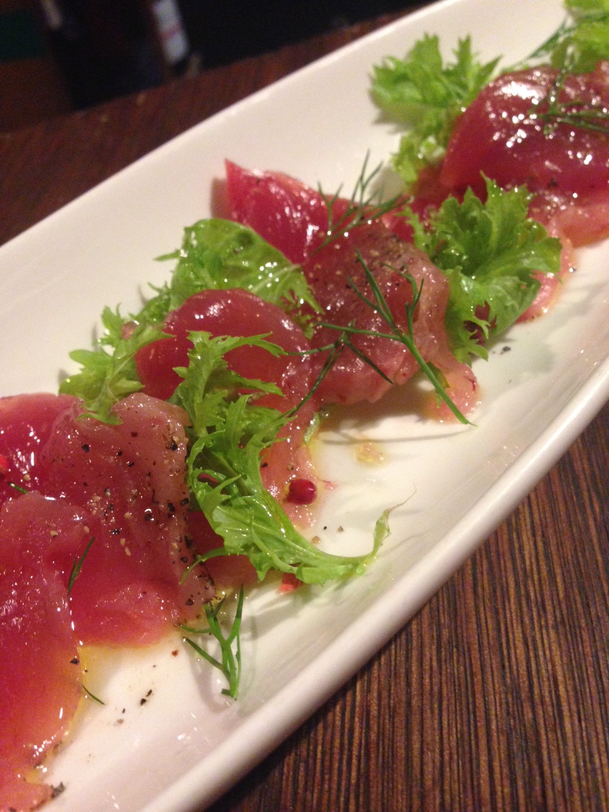佐島産本マグロのカルパッチョ 長谷川水産から今日も活きの良い 魚が入りました! 今日はみんな大好きマグロです♪ 旨味たっぷりの赤身をぜひお召し上がりください!